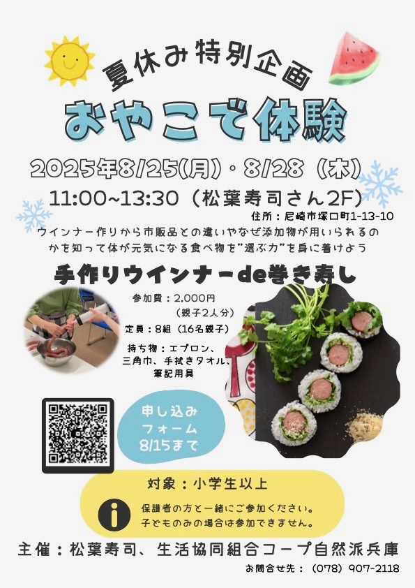 8月25日(月)と8月28日(木)の11:00〜13:30まで弊店の2階のお座敷にて「おやこで体験、手作りウインナーde巻き寿し」イベントを実施いたします。