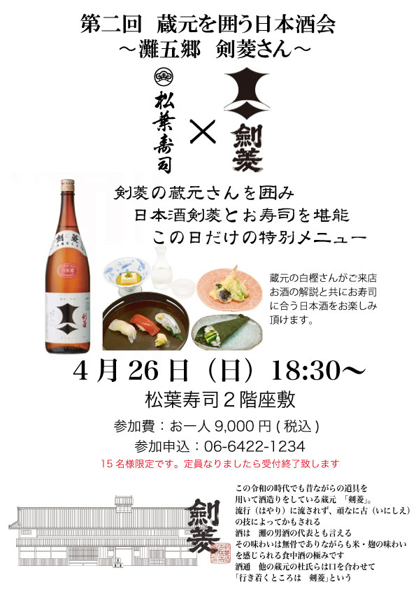 4月26日(日)18:30〜実施致します!今回お越しいただく蔵元様は「剣菱」です!